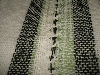 Xale ou cachecol, este verde e branco, ganha charme com um bordado feito no próprio tear.