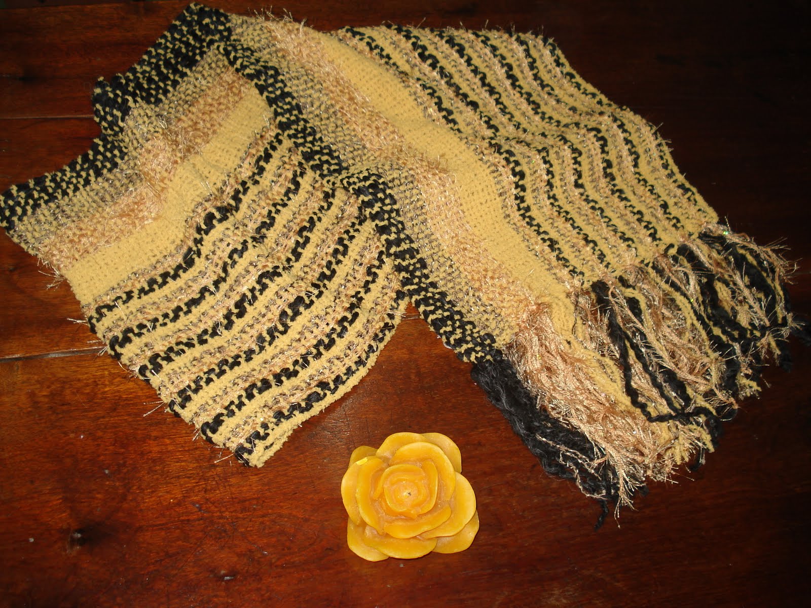 Elegante, a peça acima, leva preto, marrom, dourado e um amarelo queimado. Pode ser usada como cachecol xale ou echarpe.
